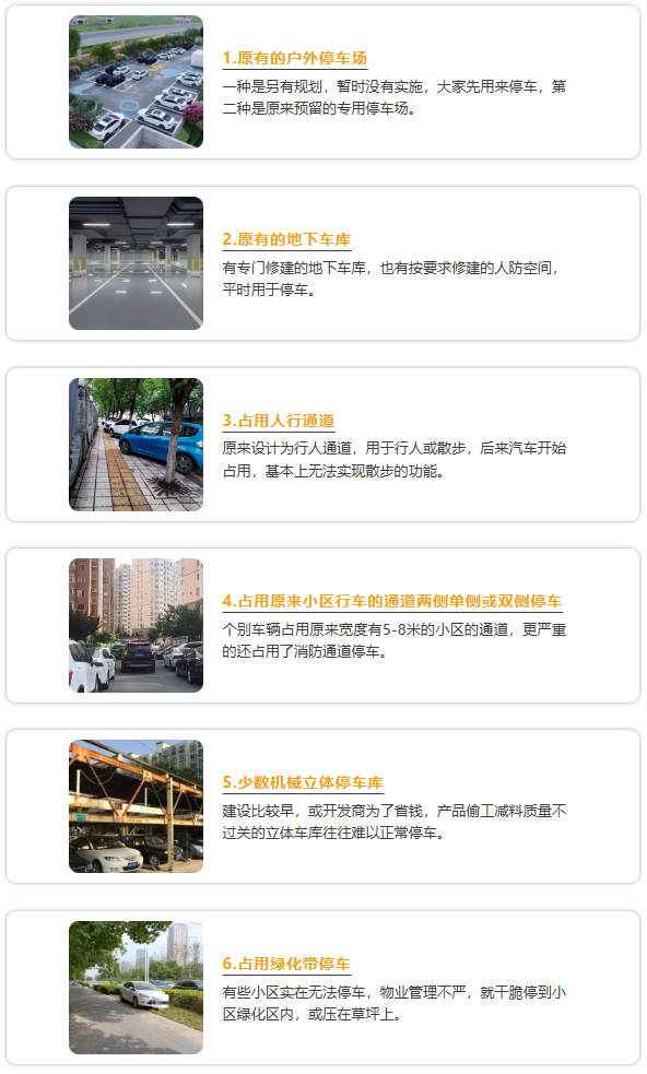 停车困境的具体情况因地而异,我们可以将其归纳如下六种: